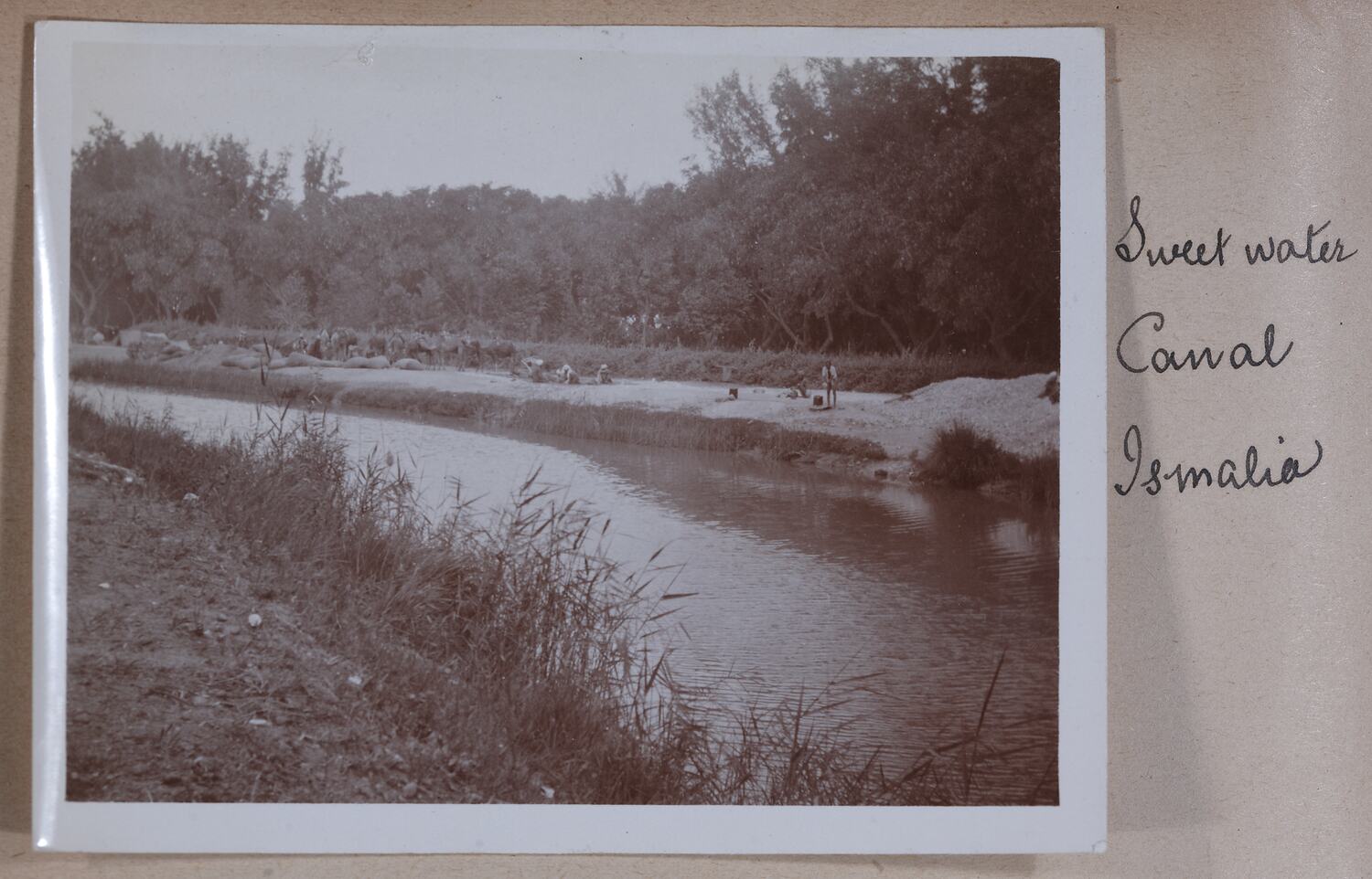 Hand-written in ink on the support to the right of the photograph: 'Sweet water / Canal / Ismalia' Hand-written in ink on the back of the photograph: 'Sweet water Canal, / Ismalia' Hand-written in pencil on the back: '(illegible)'