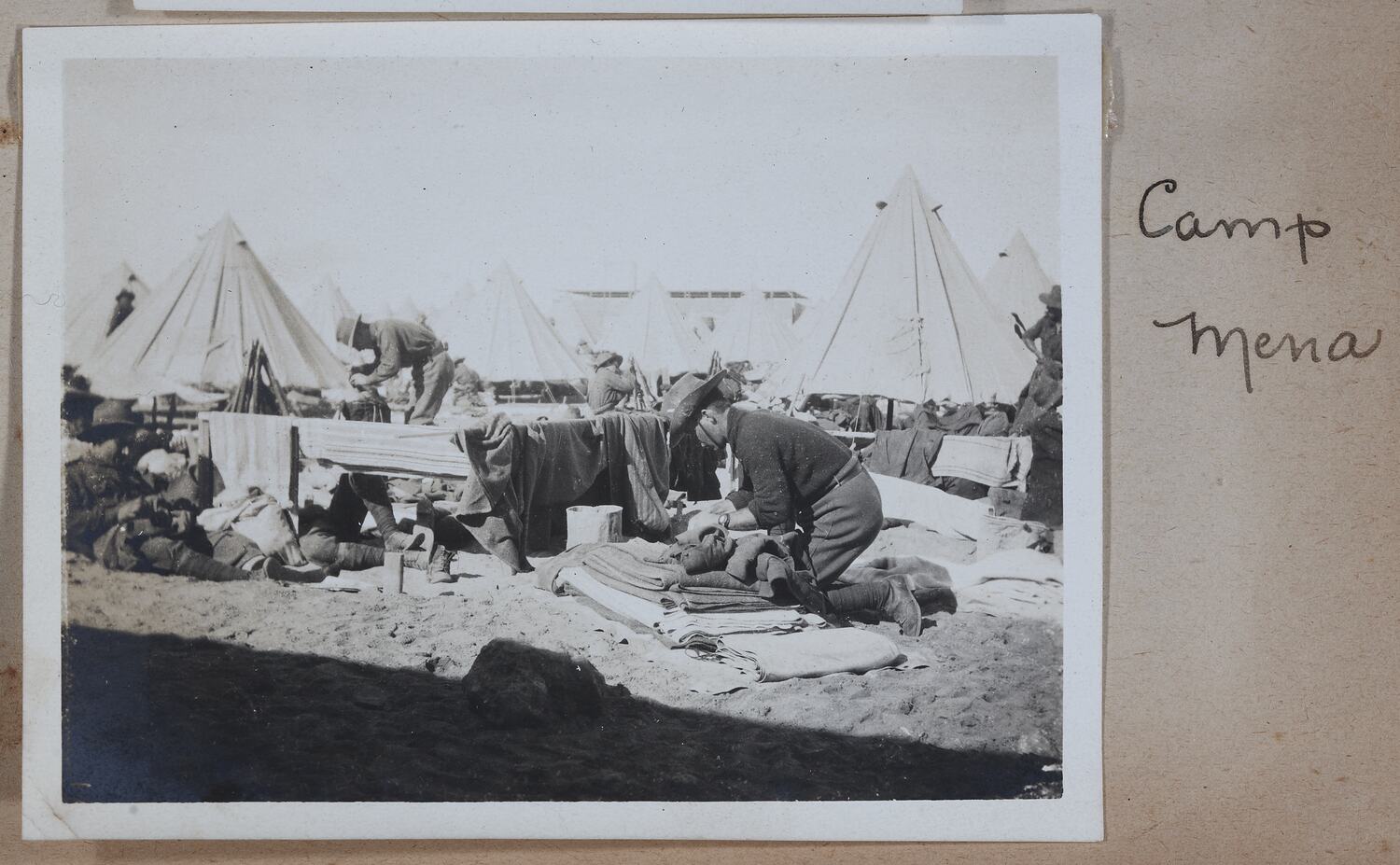 Hand-written in ink on the support to the right of the photograph: 'Camp / Mena' Hand-written in pencil on the back of the photograph: 'In Camp M(illegible) / (horizontal line)'