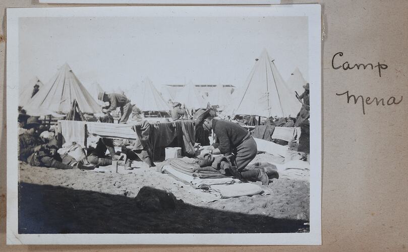 Image depicting men sorting through belongings at Mena Camp, Egypt. Mena Camp was one of three training camps in Egypt that were used by the A.I.F. and the N.Z.E.F.