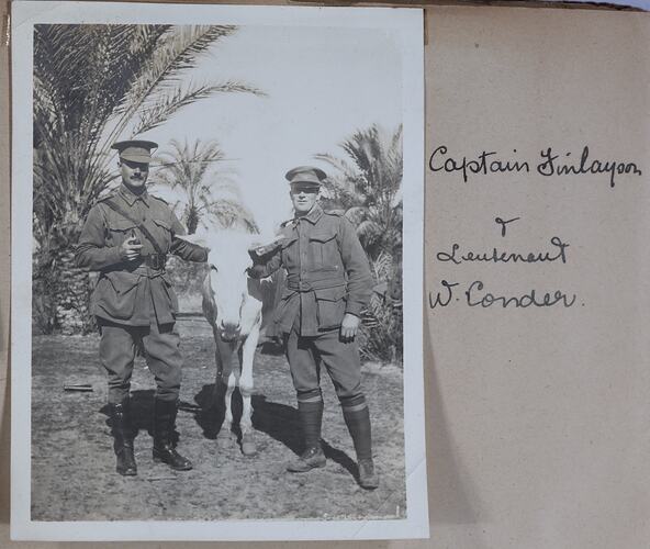 Hand-written in ink on the support to the right of the photograph: 'Captain Finlayson / & / Lieutenant / W. Conder' Hand-written in pencil on the back of the photograph: 'Capt Finlayson / & Wally Conder'