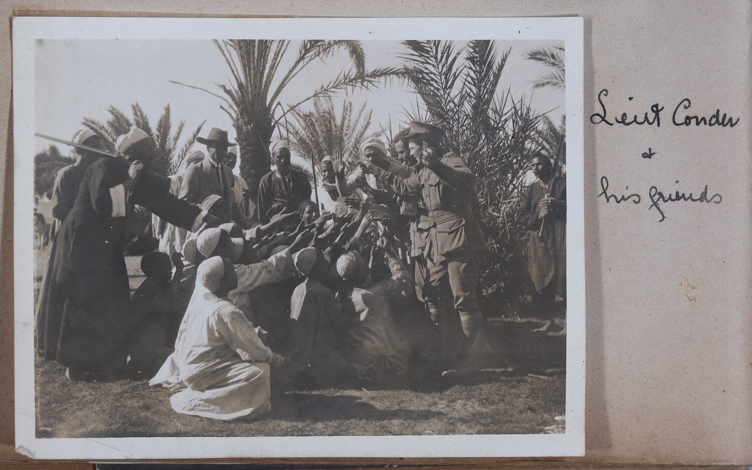 Hand-written in ink on the support to the right of the photograph: 'Lieut Conder / & / his friends' Hand-written in pencil on the back of the photograph: 'Wally Conder & pals'