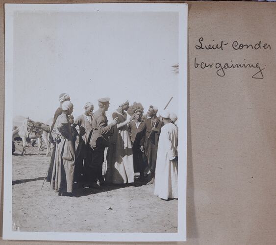 Hand-written in ink on the support to the right of the photograph: 'Lieut Conder / bargaining' Hand-written in pencil on the back of the photograph: 'Wally Conder / bargaining'