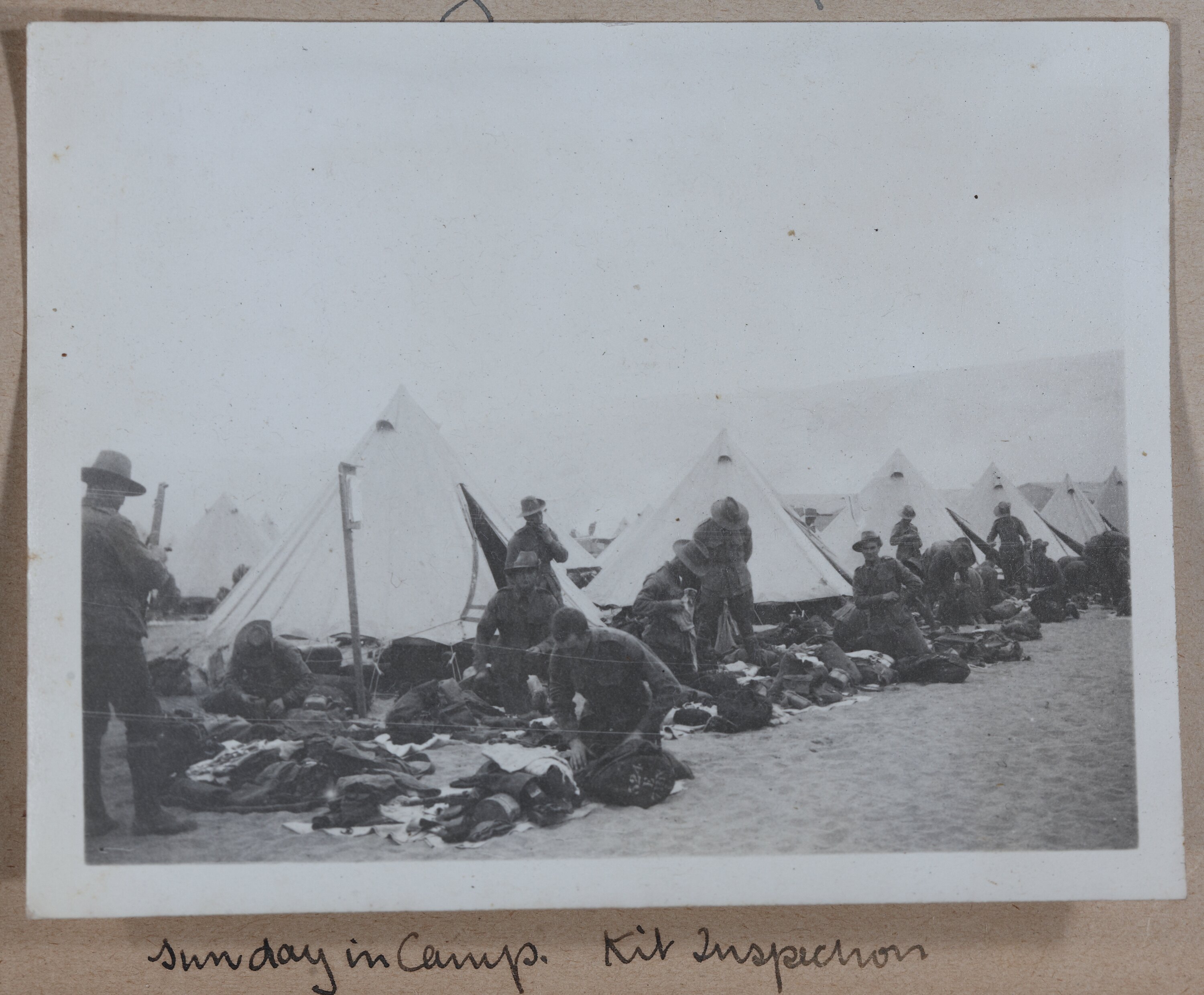 Hand-written in ink on the support underneath the photograph: 'Sunday in Camp. Kit Inspection' Hand-written in pencil on the back of the photograph: 'Sunday Morning / in Camp / Inspection of / Kits / 47'