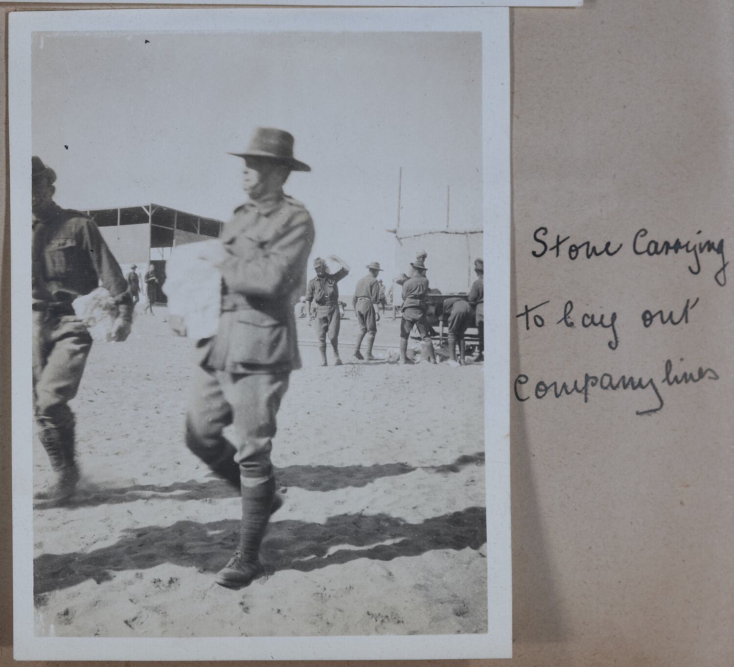 Image depicting an unnamed serviceman carrying a large stone in order to lay out the lines for Mena Camp. Mena Camp was one of the three training camps in Egypt used by the A.I.F. and the N.Z.E.F.