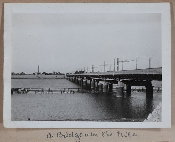 Hand-written in ink on the support underneath the photograph: 'Bridge over the Nile' Hand-written in pencil on the back of the photograph: 'A bridge over Nile / 19'