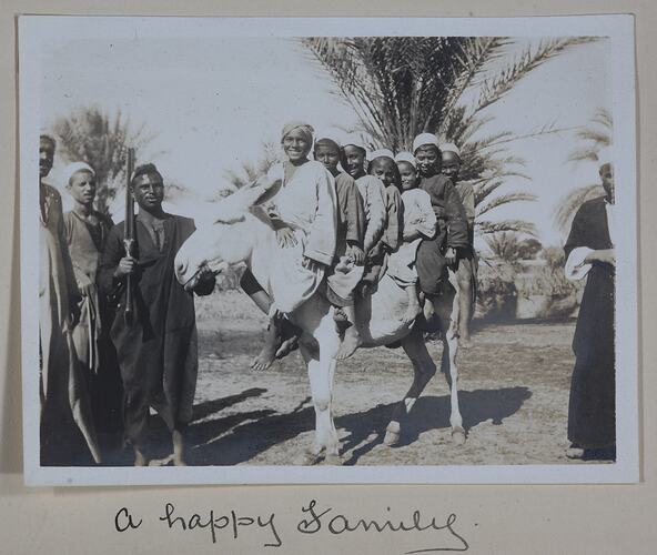 Group of seven children, in native dress, on a donkey. Half of a figure on the right hand side of the photograph who also appears to be in native garb. To the left there is a group of three men, one of who appears to be holding the donkey in position as well as having a gun in his hand. Vegetation in the background.
