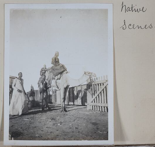 Man in native dress seated on a camel, behind him there appears to be another two men on camels. To the left of the photograph there is another man, also in native dress.