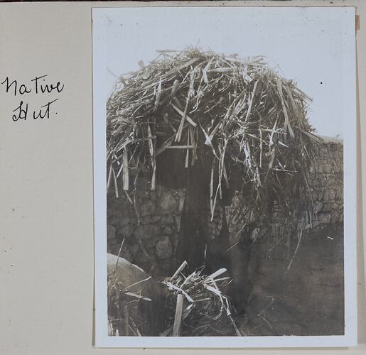Hand-written in ink on the support to the left of the photograph: 'Native / Hut' Hand-written in pencil on the back of the photograph: 'native hut'
