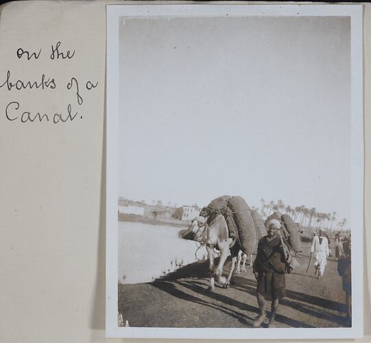Image of Egyptain men with camels walking along the banks of a canal. The specific canal is not named.