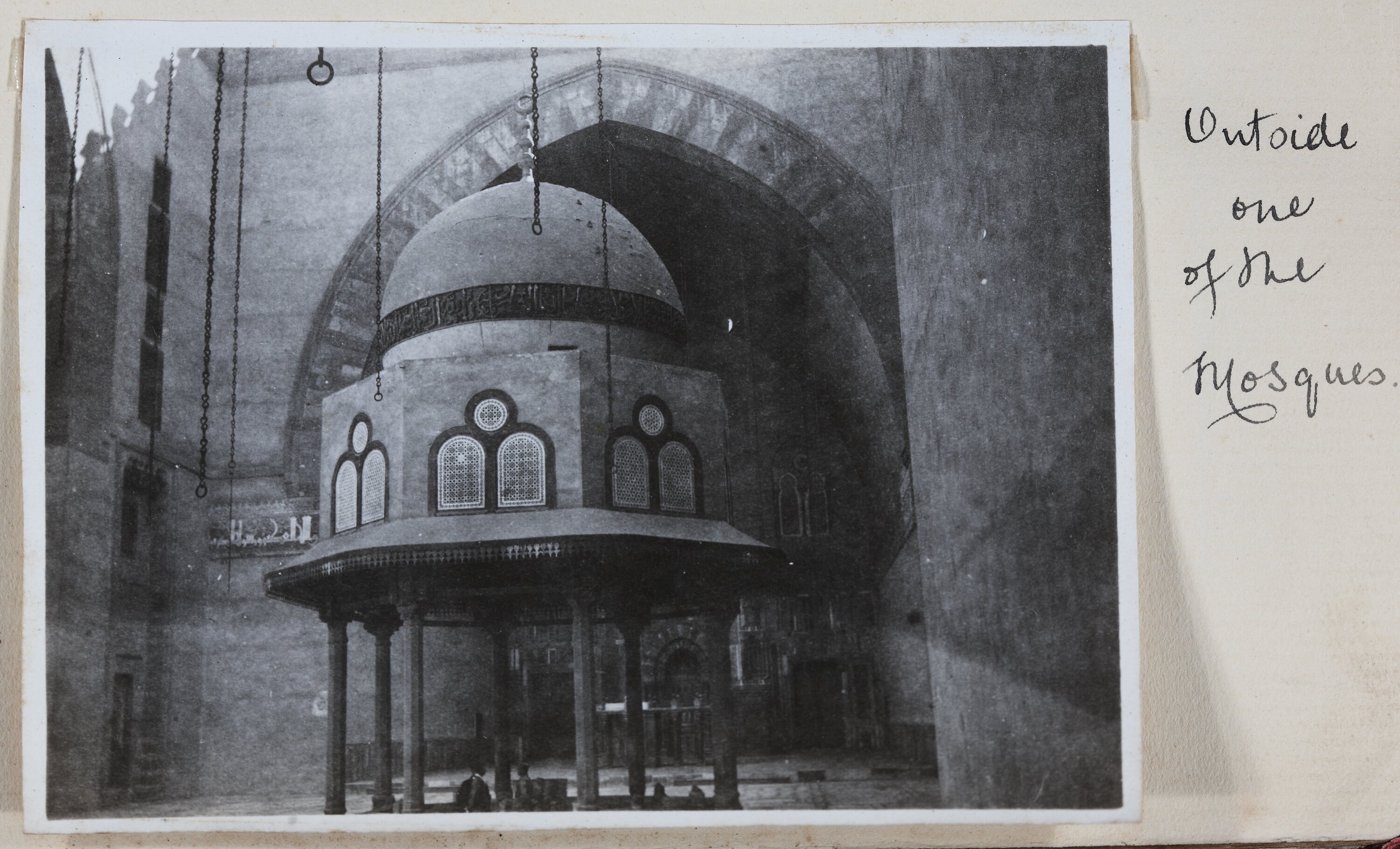 Hand-written in ink on the support to the right of the photograph: 'Outside / one / of the / Mosques' Hand-written in pencil on the back of the photograph: 'just outside the Mosque / 19'