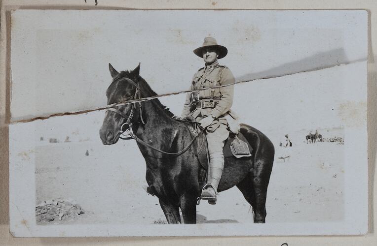 Hand-written on the support underneath the photograph and in the middle of the album page: 'Captain R. H. Henderson' Hand-written in pencil on the back of the photograph: 'Captain Henderson / 7th A.I.F. / Son of G.G. Henderson / (illegible) agent (illegible) / 54'