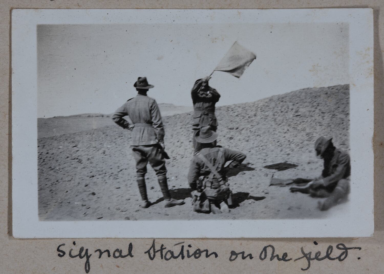 Hand-written in ink on the support underneath the photograph: 'Signal Station on the Field.' Hand-written in pencil on the back of the photograph: 'A signal station / on the field / 54'