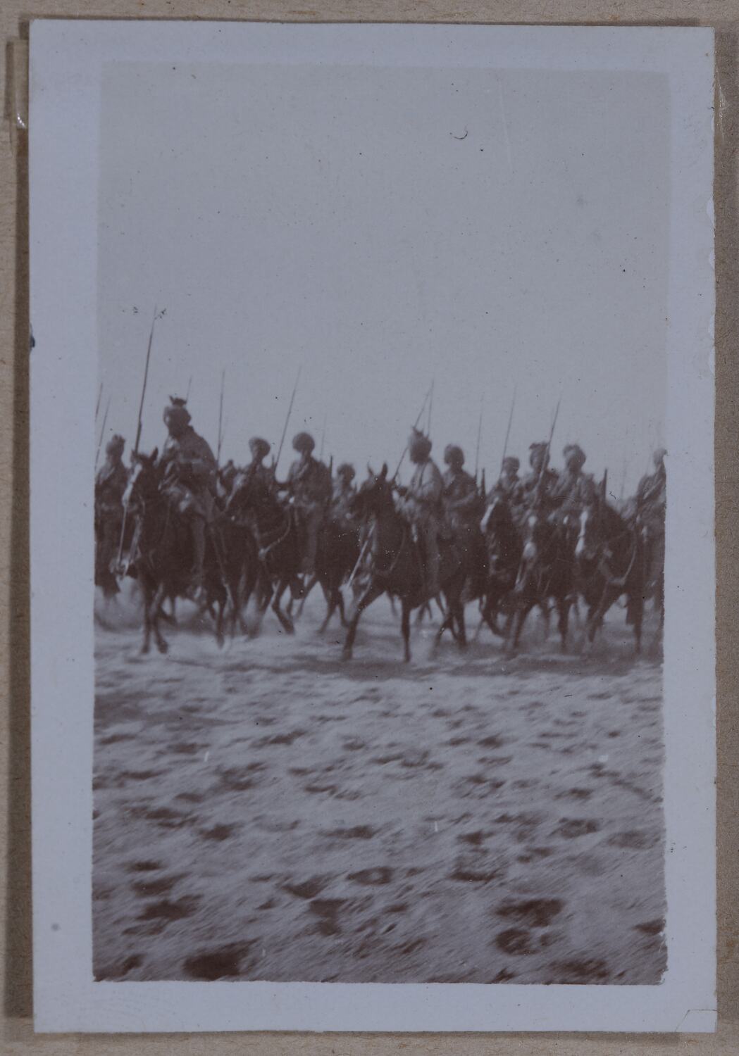 Group of men in uniform, all wearing turbans, mounted on horseback and riding in what appears to be a formation.