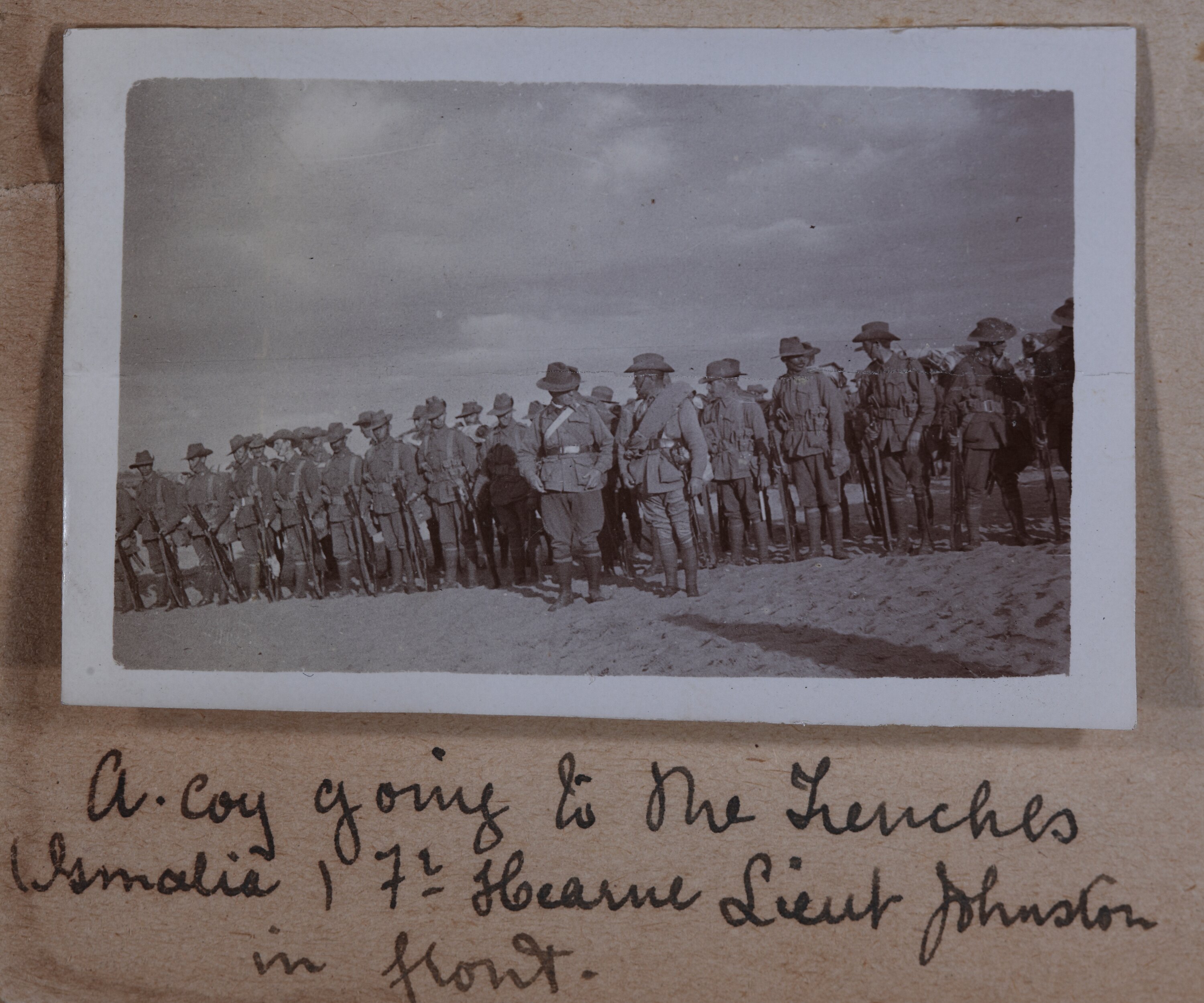 Hand-written in ink on the support underneath the photograph: 'A Corp. going to the Trenches / (Ismalia) Fr. Hearne Lieut. Johnston / in front.' Hand-written in pencil on the back of the photograph: 'Ismalia / A Corp. ready to / Go to trenches / Father Hearne / & / Lieut. Johnston / in front / 75 / 2-1'