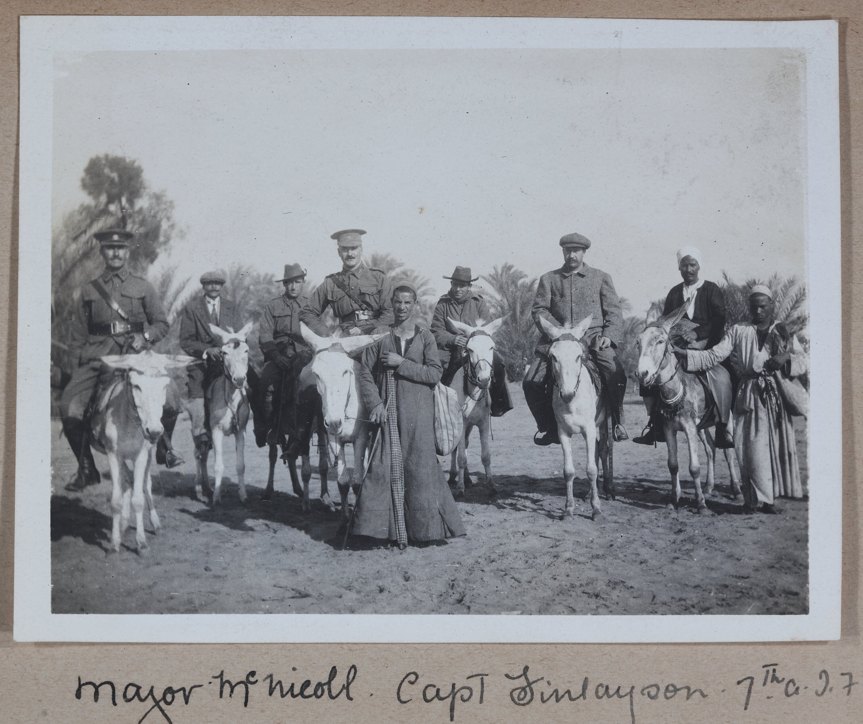 Image depicting Major McNicholl (left) and Captain Finlayson (right) mounted on donkeys with Egyptians. Major Walter Ramsey McNicholl was assigned to the Headquarters of the 7th Battalion. He returned to Australia in 1918. Captain Christopher Finlayson was also assigned to the Headquarters of the 7th Battalion. He was wounded in early April 1915 and returned to Australia in 1916.