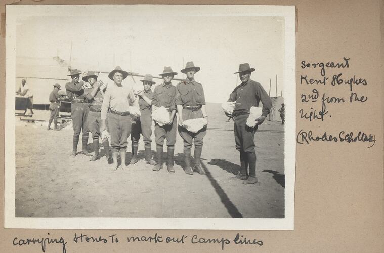 Written in ink on mount: 'carry stones to mark out camp lines / Sergeant / Kent Hughes / 2nd from the / right. / Rhodes Scholar'.