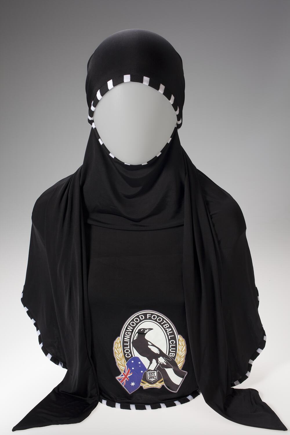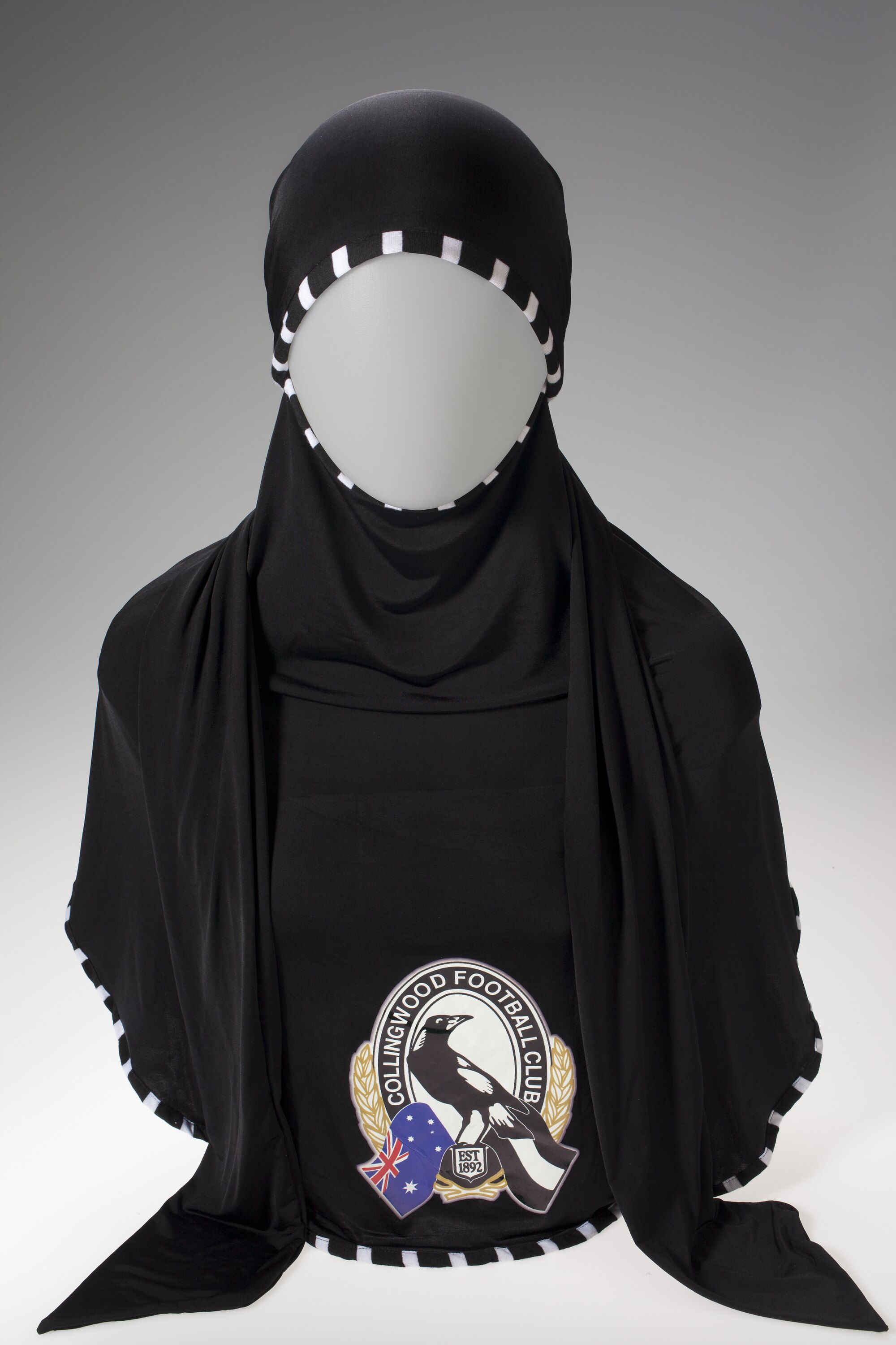 Black hijab made from lycra material with a black and white striped band around the head, neckline and at the bottom edge of the hijab. It represents the colours of the Collingwood AFL team. On the chestpiece is an iron-on Collingwood Football Club Logo of a black and white magpie, the Australian and black and white flags.