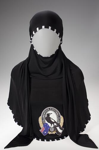 Black and white hijab with Collingwood Football Club logo, made by Shanaaz Copeland of Yaz's Design in 2010. She has patented her design as it allows for a great range of flexibility in style in the one hijab, reflecting the variety of ways of wearing a hijab and the styles and tastes of Muslim women. Her company is based in the Melbourne suburb of Brunswick. Shanaaz has created hijabs in St Kilda, Essedon, Collingwood, Hawthorn and Port Adelaide colours.