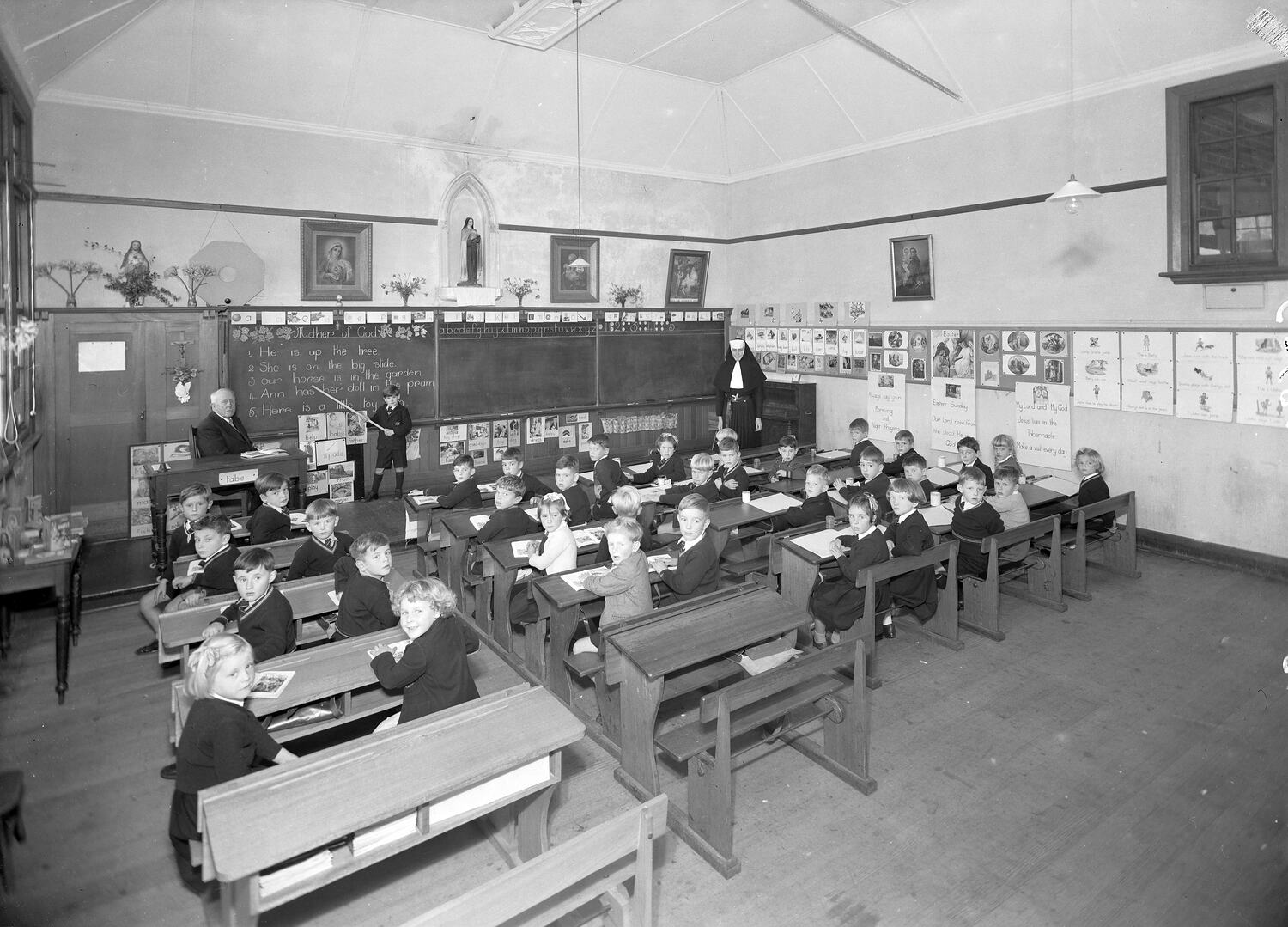Classroom showing rows of male and female students seated at desks. A nun, male teacher and boy holding a pointer stick are pictured at the front of the classroom. Religious iconography is shown above a blackboard in the background.
