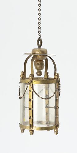 Gold metal and glass cylindrical light fitting. Fine chain at top of light fitting.