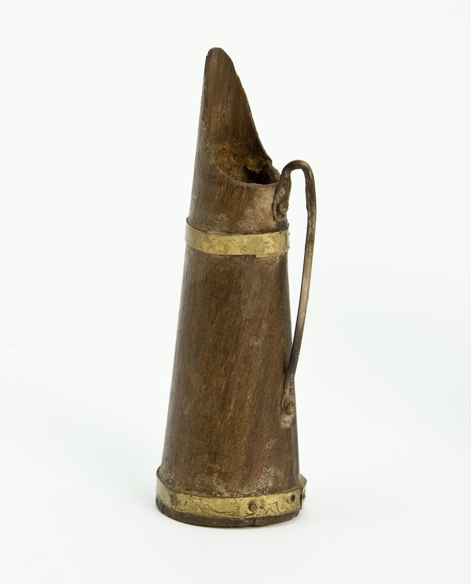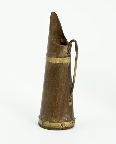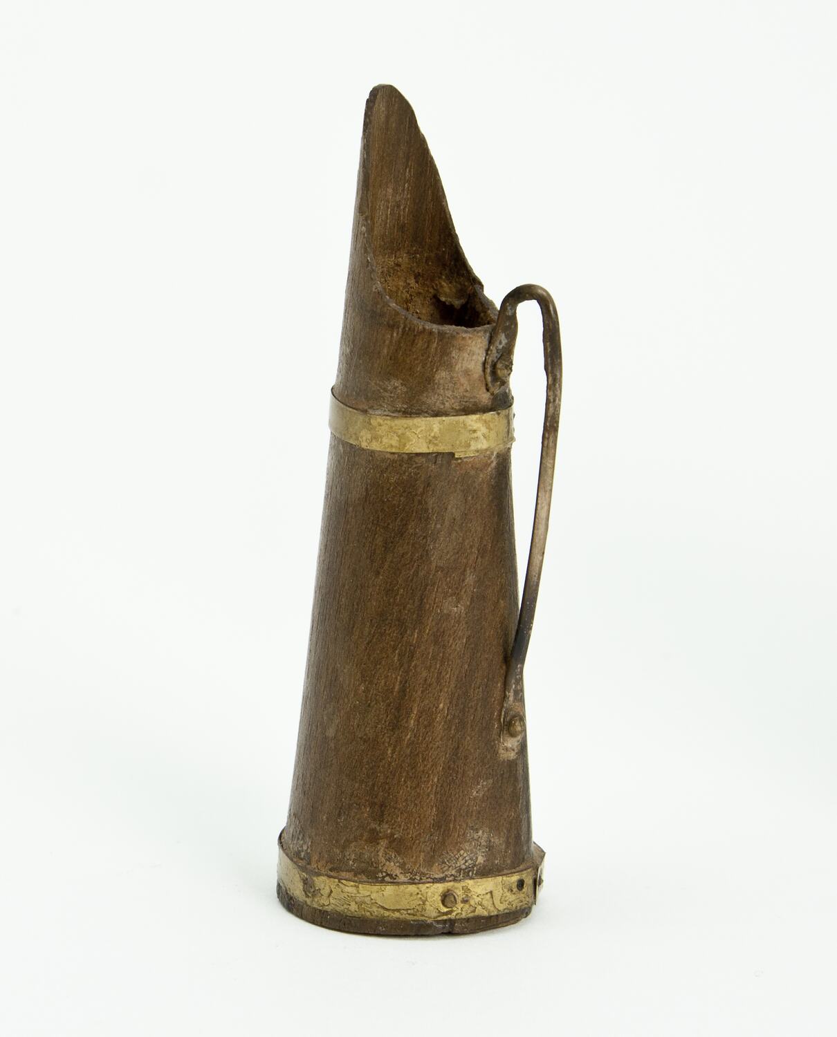 Wooden ewer used for filling bath tub. Two metal bands and a handle.