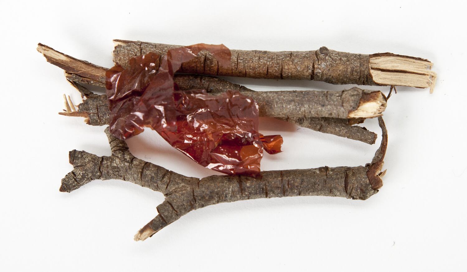 Four small twigs and a piece of red cellophane representing a log fire.