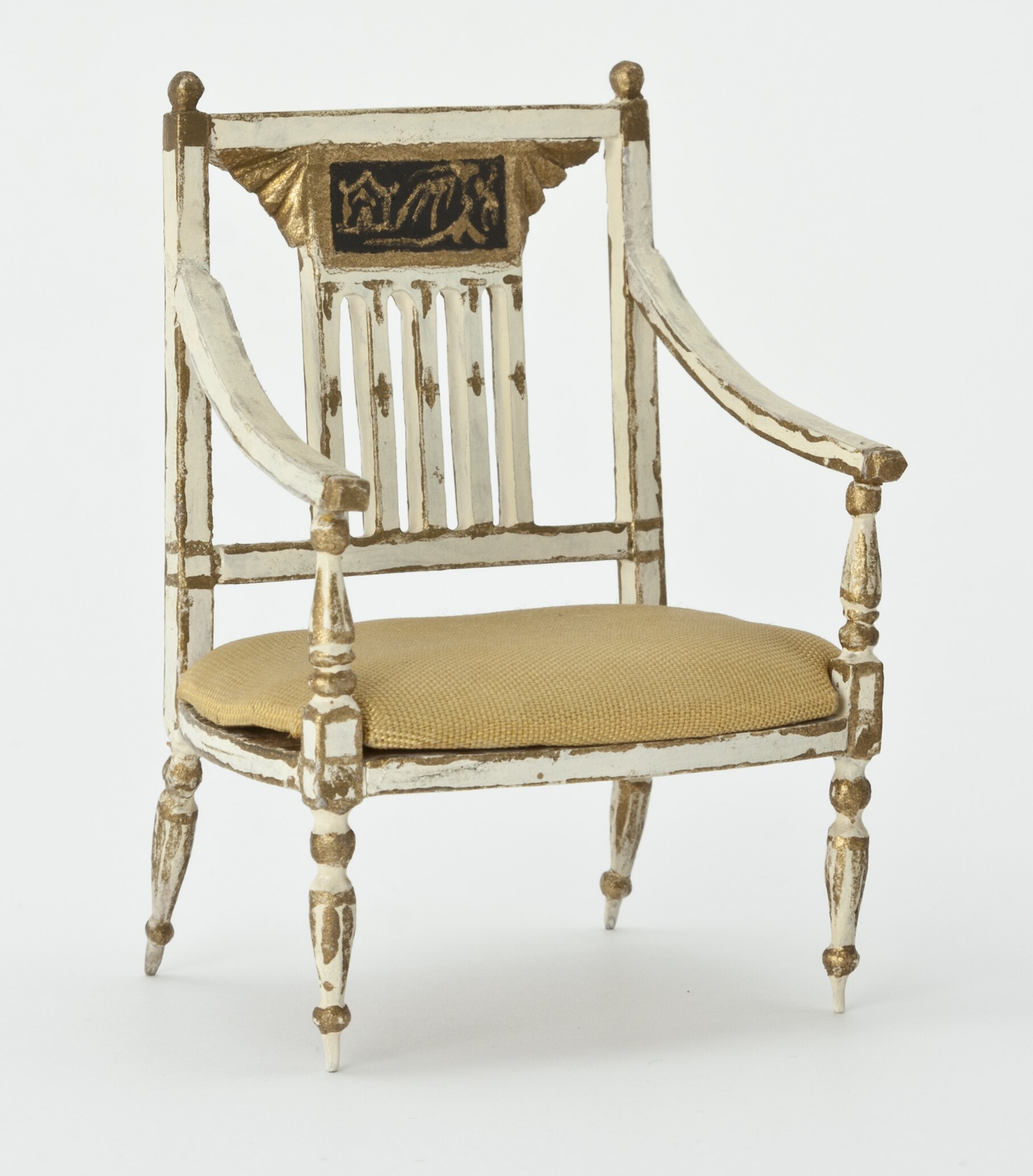 Chair with gold covered seat. Chair is painted cream with black and gold detail on back. Chair has arms and turned legs.