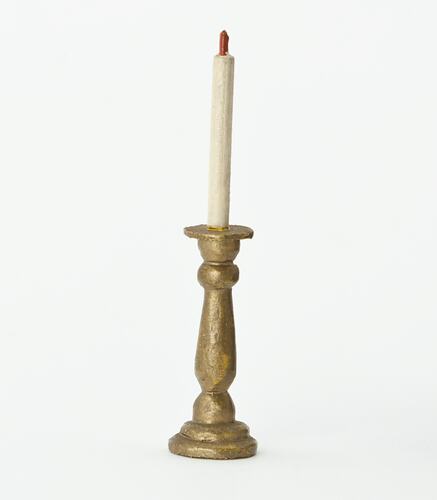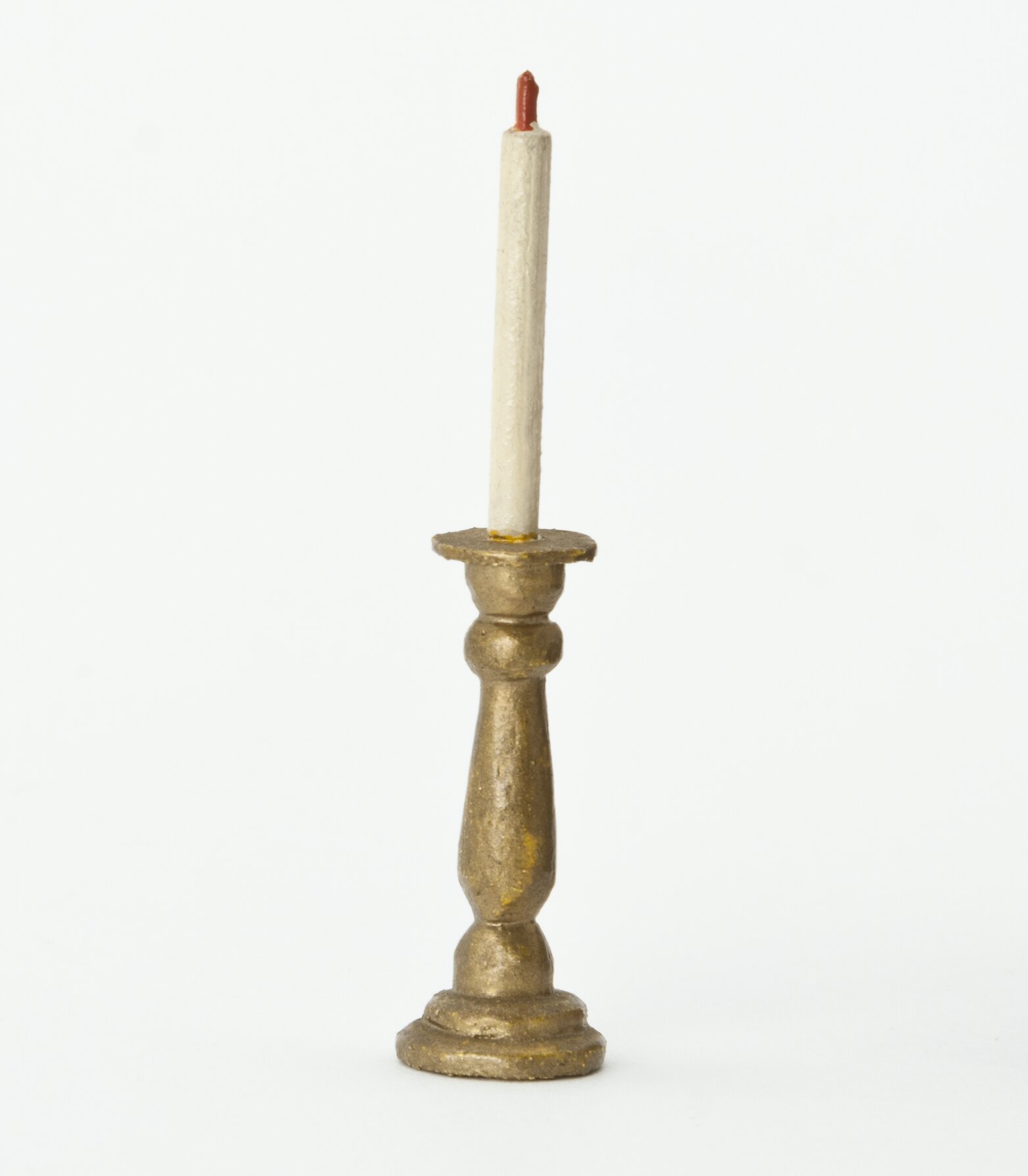 Gold painted wooden candlestick with a white taper candle with a red wick.