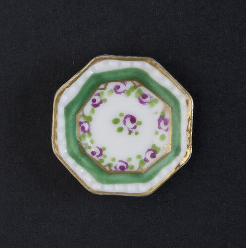 Eight sided plate which has a white background with a fine gold border. Within the gold border is a white border, a green border and red and green flowers.