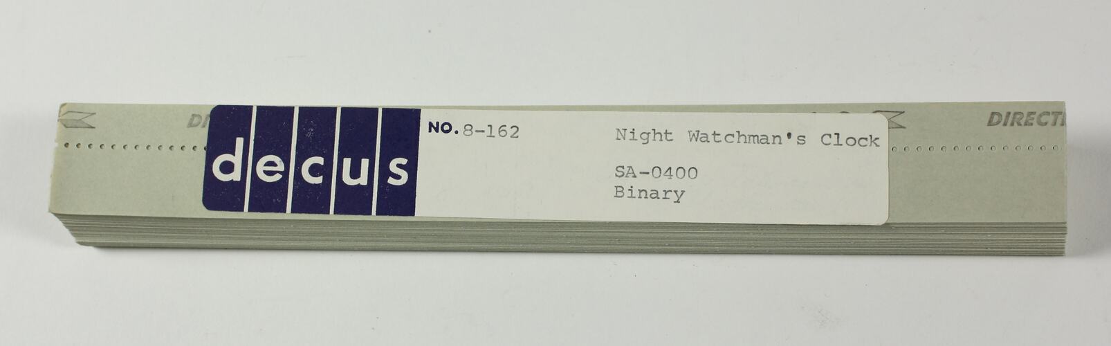 On label: ' decus NO. 8-162 Night Watchman's Clock / SA-0400 / Binary ' On paper tape: ' DIRECTIONAL TAPE '
