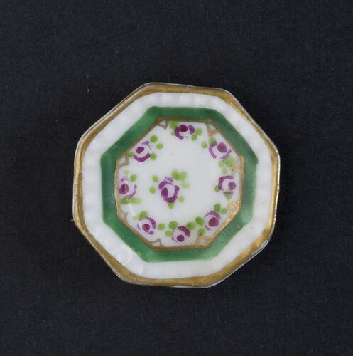 Eight sided plate which has a white background with a fine gold border. Within the gold border is a white border, a green border and red and green flowers.