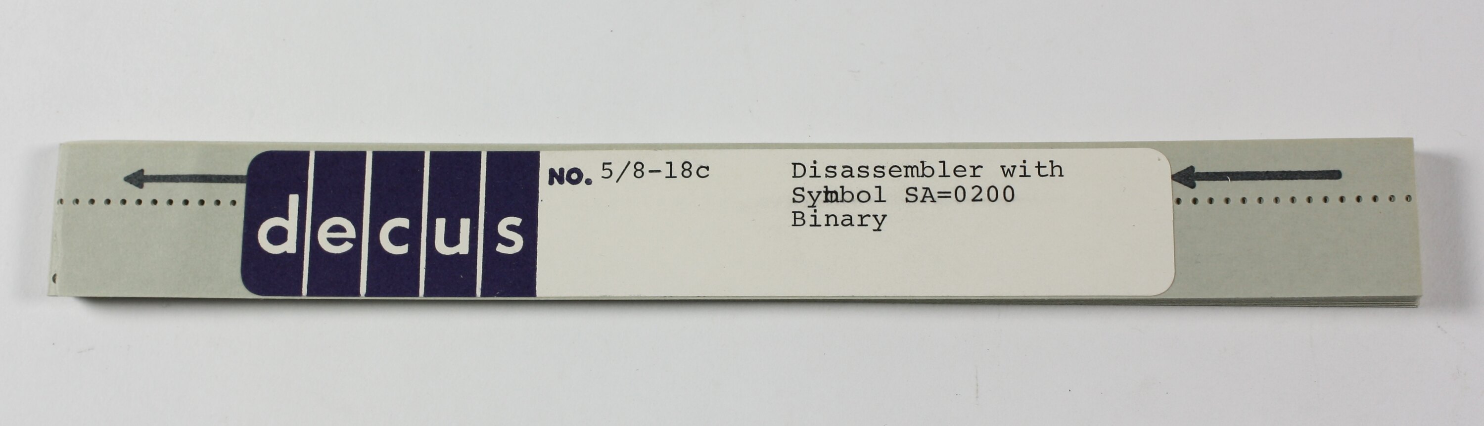 On label: ' decus NO. 5/8-18c Disassembler with / Symbol, SA=0200 / Binary'