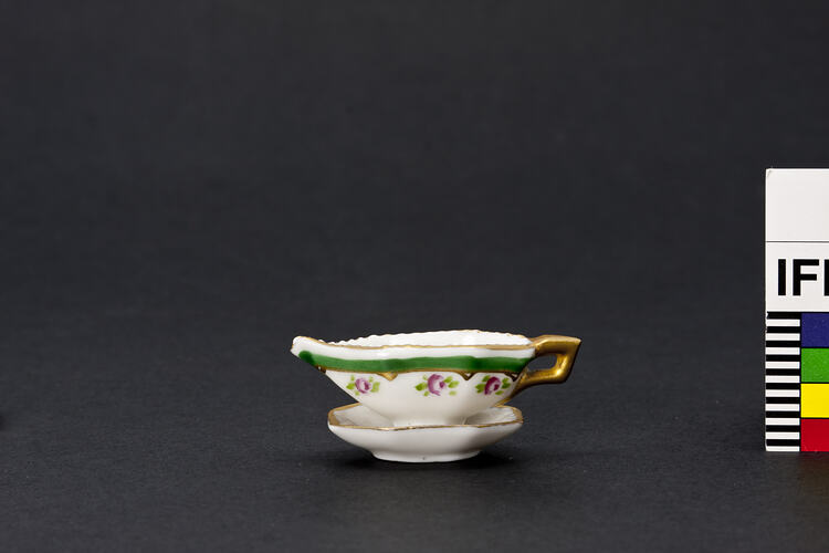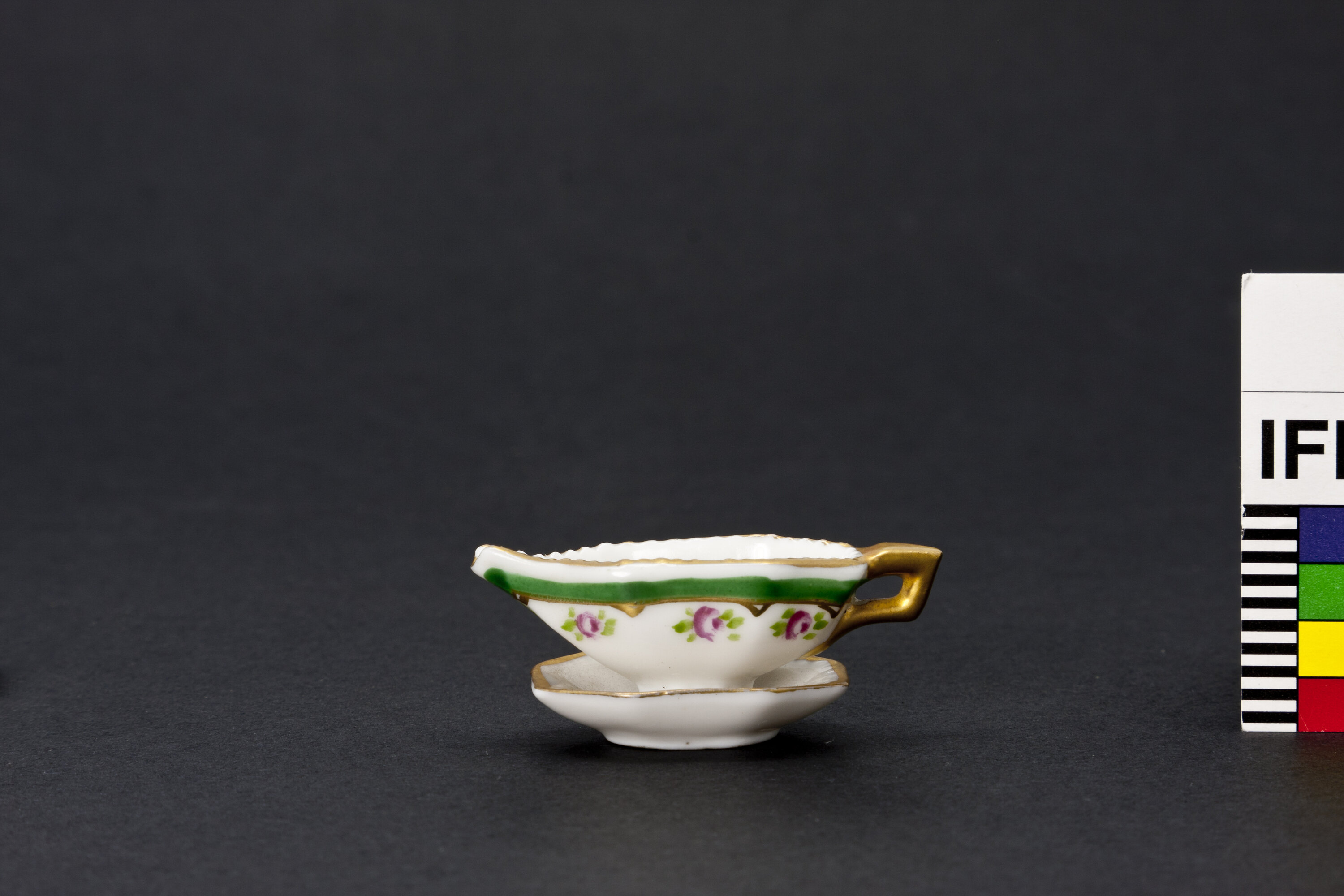 Gravy boat and stand from dinner service from Room 17 - Morning Room, Main Building Section, Pendle Hall. From alcove to left of fireplace.