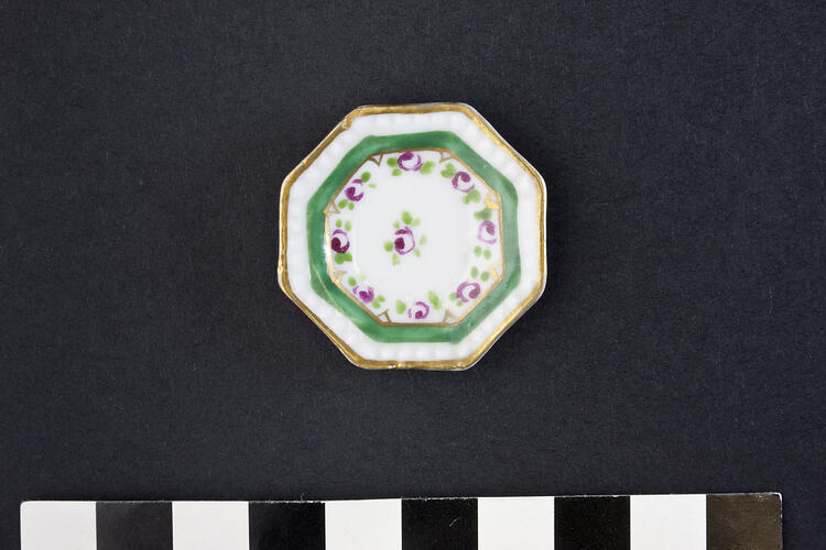 Ceramic eight sided plate which has a white background with a fine gold border. Within the gold border is a white border, a green border and red and green flowers.