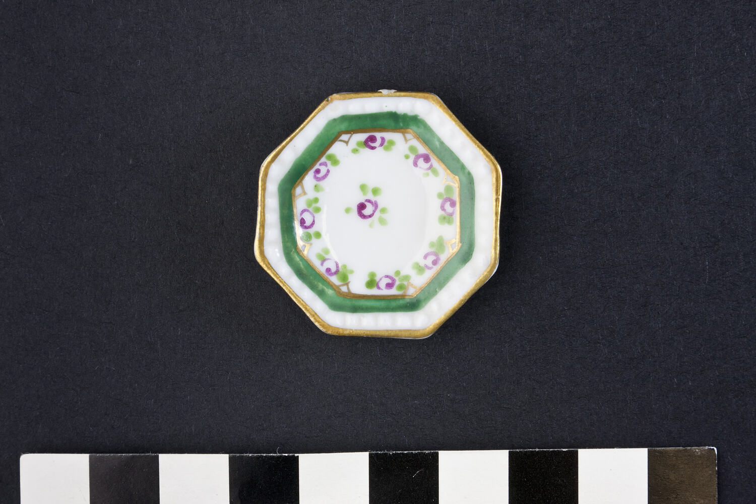 Ceramic eight sided plate which has a white background with a fine gold border. Within the gold border is a white border, a green border and red and green flowers.
