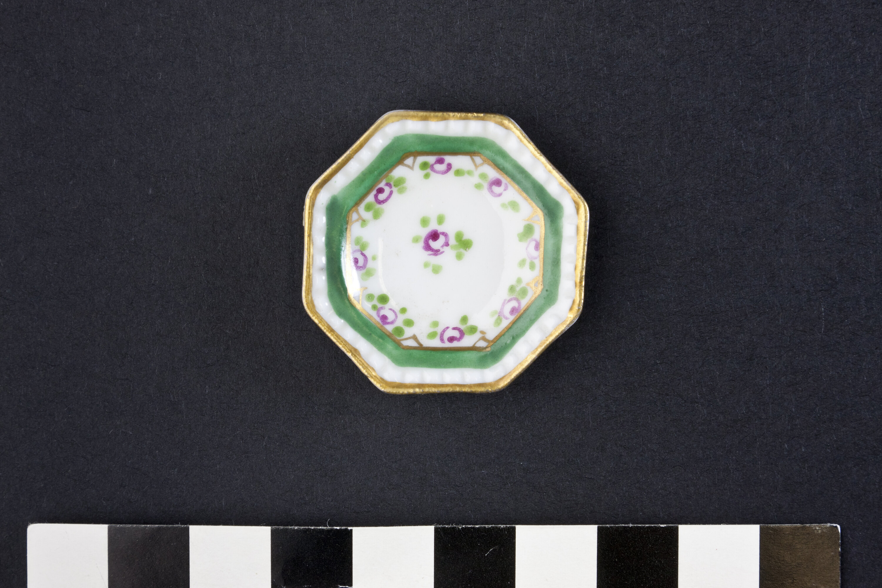 Plate from dinner service from Room 17 - Morning Room, Main Building Section, Pendle Hall. From alcove to right of fireplace.