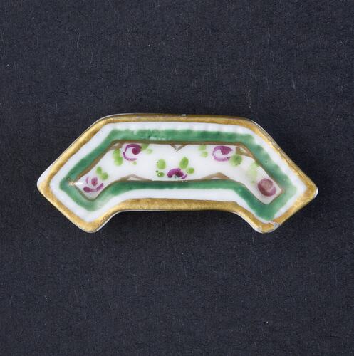 Ceramic eight sided U-shaped dish which has a white background with a fine gold border. Within the gold border is a white border, a green border and red and green flowers.
