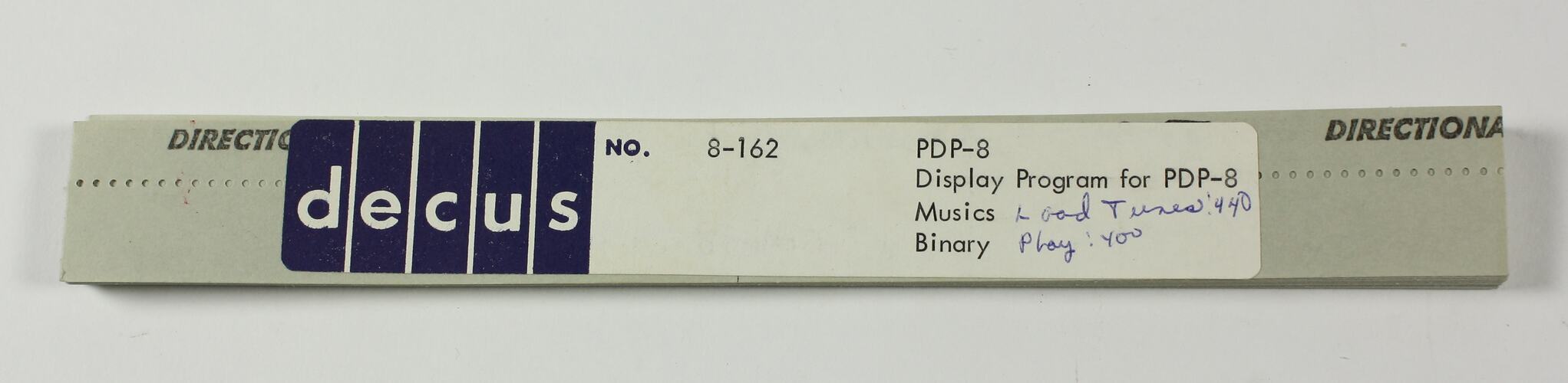 On label: ' decus NO. 8-162 PDP-8 / Display Program for PDP-8 / Musics / Binary ', handwritten ' Load Tunes! 440 / Play! Yoo ' On paper tape: ' DIRECTIONAL TAPE '