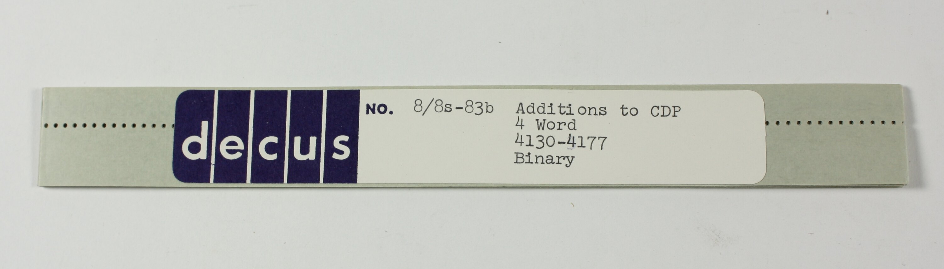 The punched paper tape is a software program for a PDP8 microcomputer. The program was prepared by DECUS (Digital Equipment Computer Users' Society), an independent user group founded in 1961. Paper tape was a reliable and inexpensive (although slow) method of loading and storing programs, prior to magnetic discs and tapes, and was still in use in the 1970s.