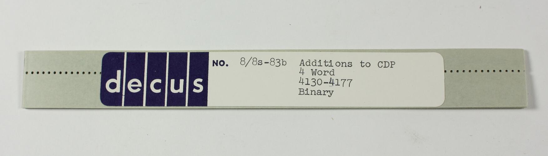 On label: 'decus NO. 8/8s-83b Additions to CDP / 4 Word / 4130-4177 / Binary' On paper tape: 'DIRECTIONAL TAPE'
