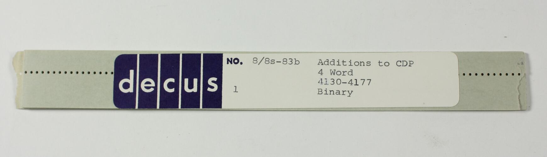 On label: 'decus NO. 8/8s-83b Additions to CDP / 4 Word / 4130-4177 / 1 Binary' On paper tape: 'DIRECTIONAL TAPE'