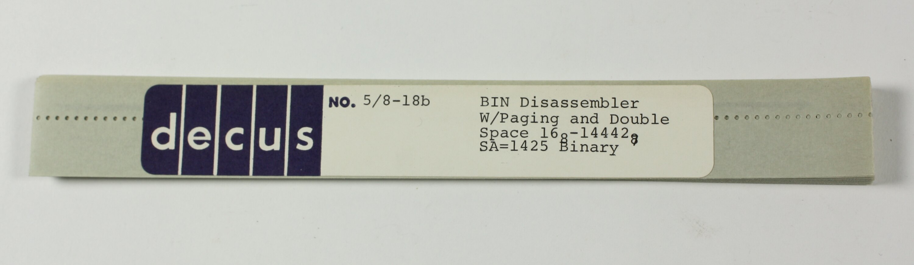 On label: ' decus NO. 5/8-18b BIN Disassembler / W/Paging and Double / Space 16 [followed by underscore 8] - 14442[followed by underscored 7 overwritten by 8 / SA=1425 Binary '