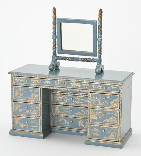 Rectangular mirror help between two turned blue and gold painted supports. Mirror pivots between supports.
