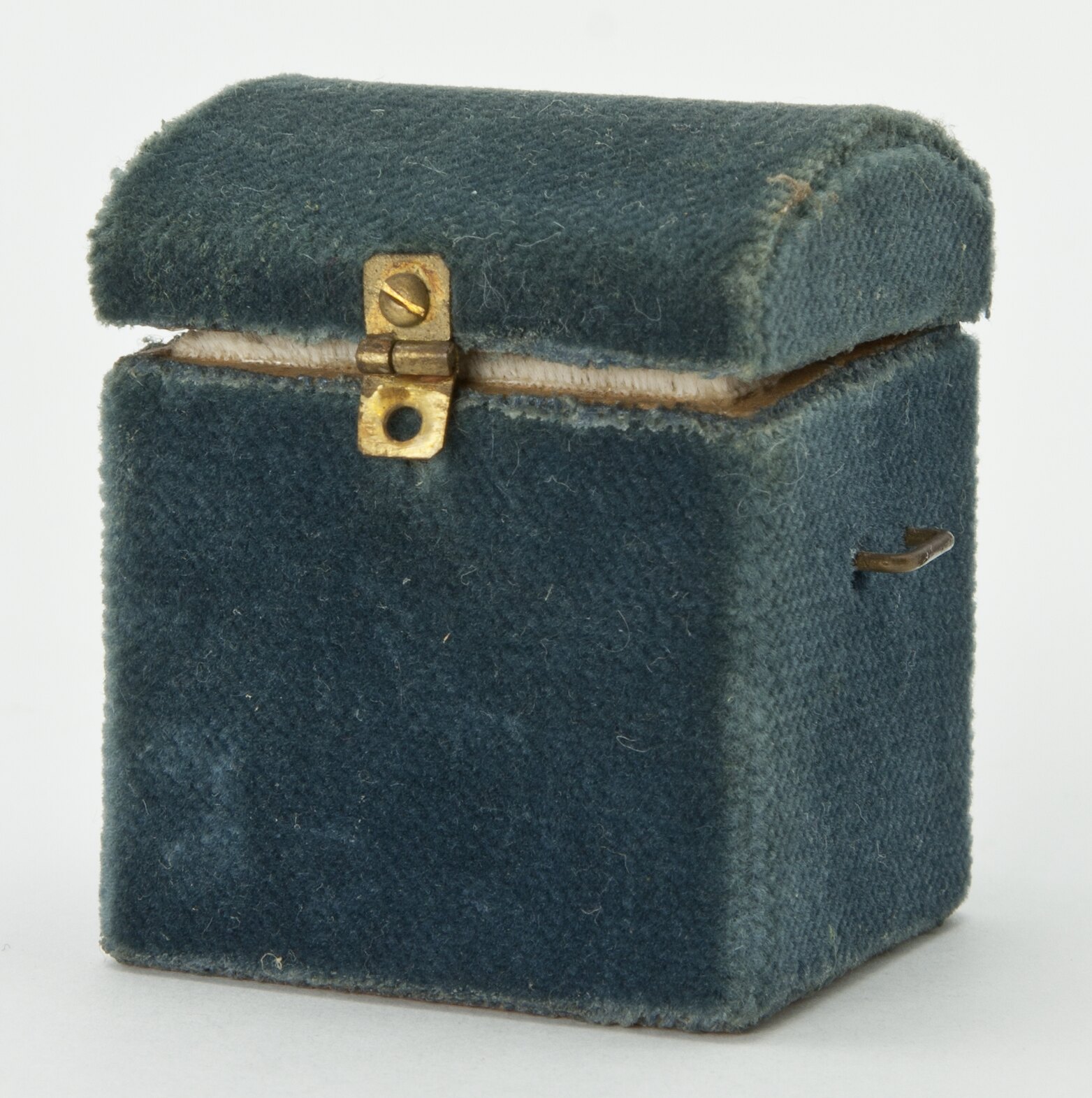 Blue velvet covered commode with hinged lid. A handle on each side of commode.
