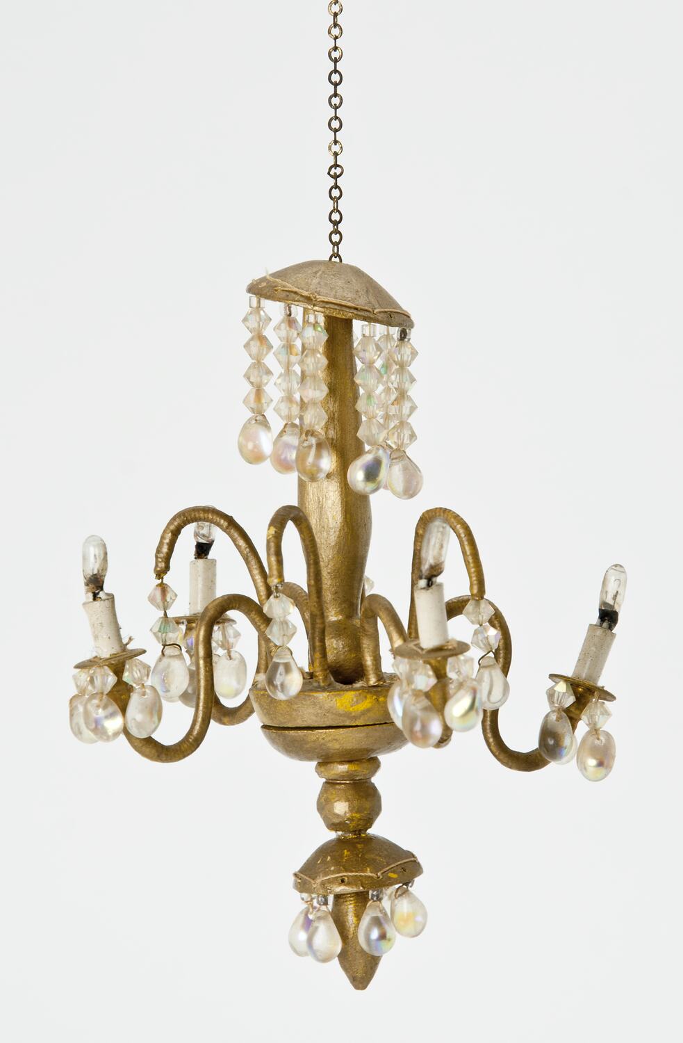 Gold painted and beaded four arm chandelier with fine gold hanging chain at top.