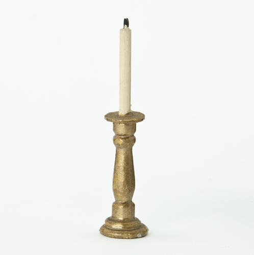 Gold painted wooden candlestick with a white taper candle with a black wick.