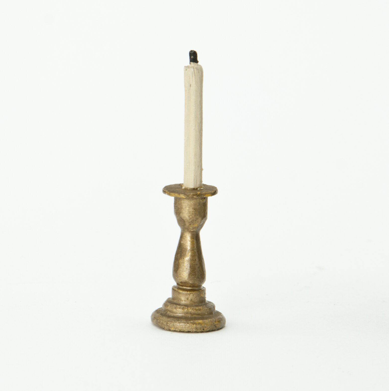 Gold painted wooden candlestick with a white taper candle with a black wick.