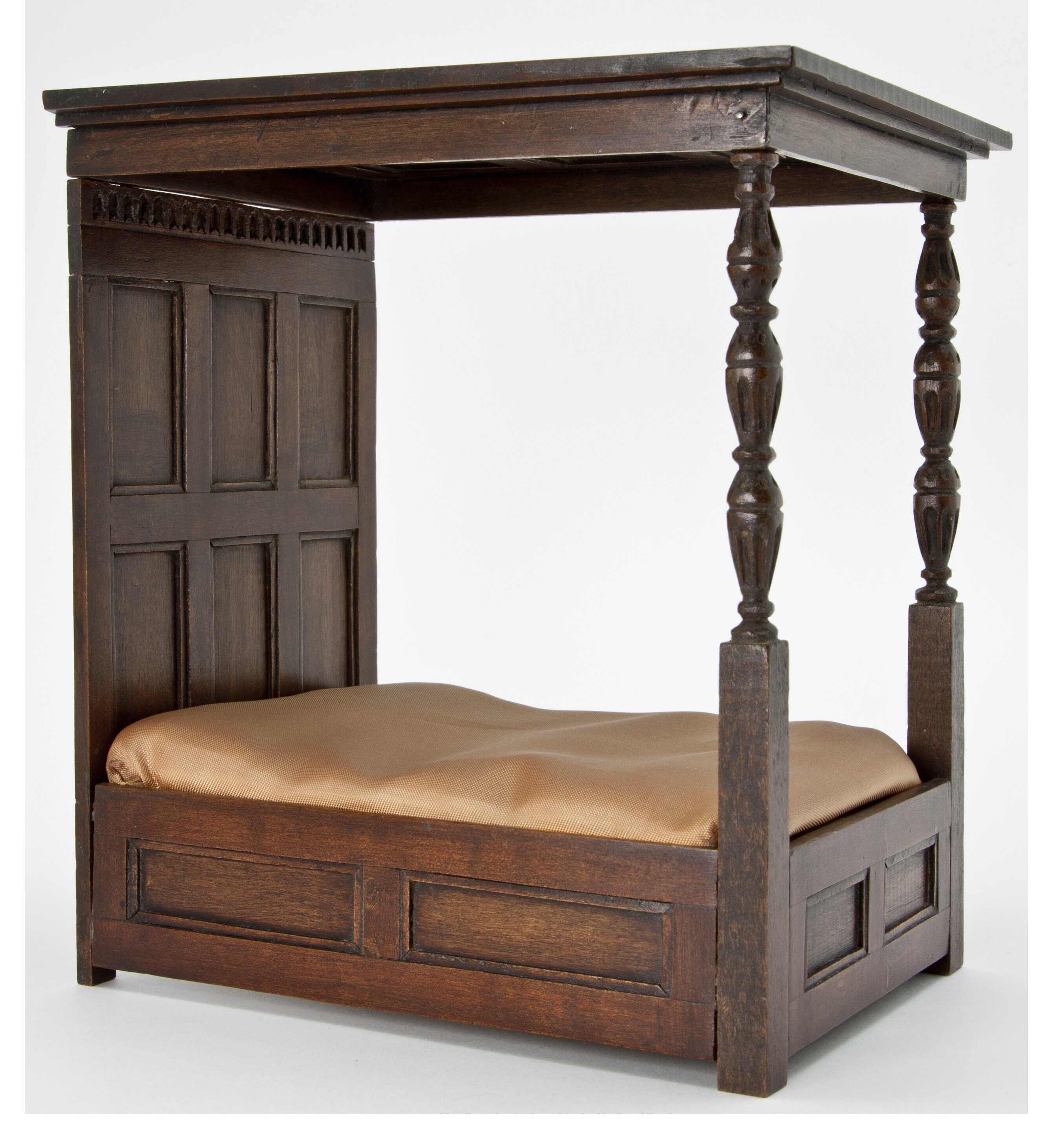 Wooden bed with carved head, sides and canopy. Two turned posts at end of bed.