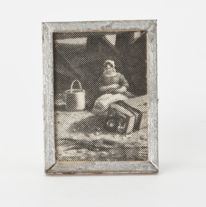Small black and white image of a woman sitting on a stool. Picture is made to resemble a framed photograph in a silver frame.
