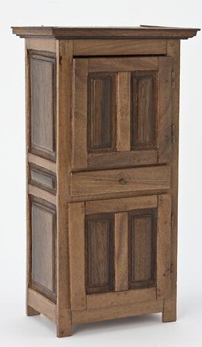 Tall wooden cupboard with two opening doors and a drawer in the middle between the two doors.